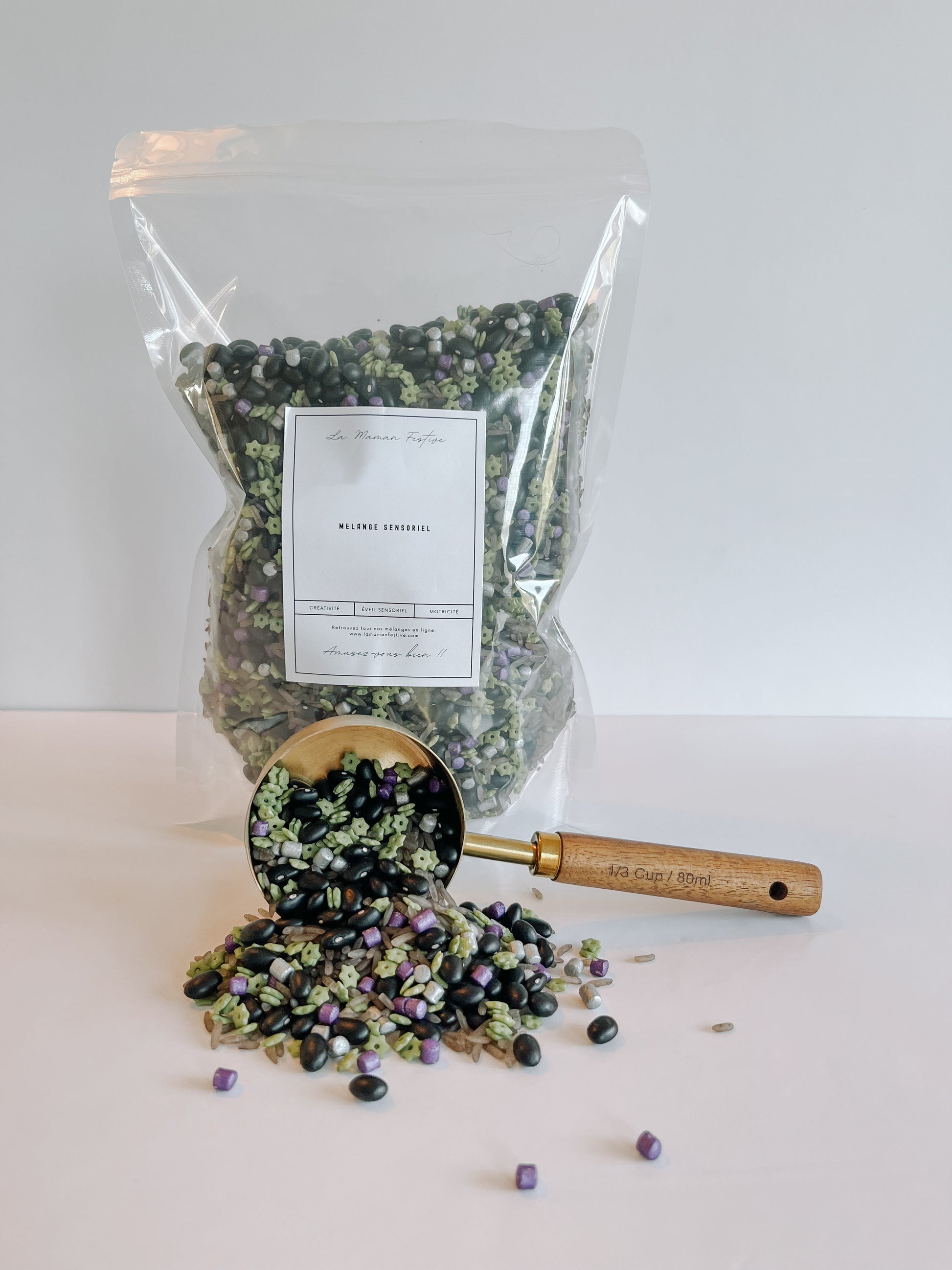 La Maman Festive offre une large gamme de mélanges sensoriels pour le plus grand plaisir de vos tout-petits. Nos mélanges sont toujours en format de quatre (4) tasses puisque c'est la quantité requise pour remplir un bac sensoriel standard.