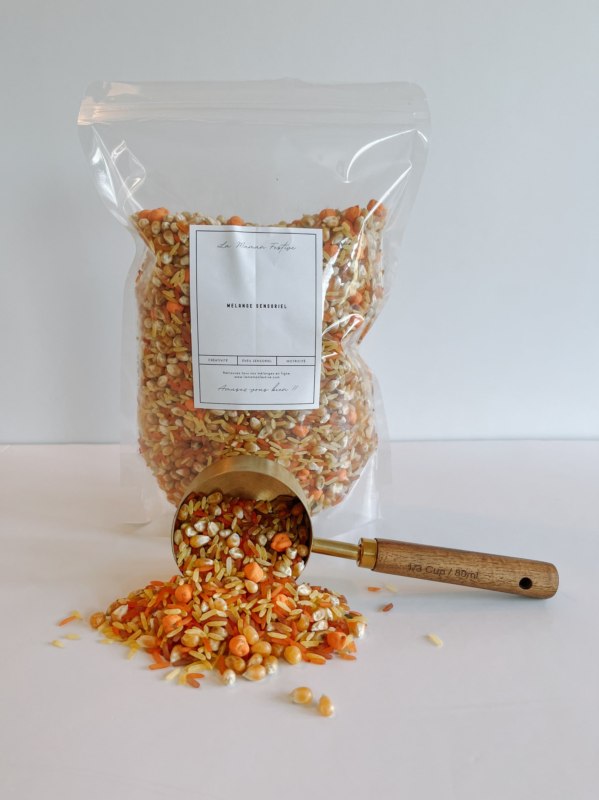 La Maman Festive offre une large gamme de mélanges sensoriels pour le plus grand plaisir de vos tout-petits. Nos mélanges sont toujours en format de quatre (4) tasses puisque c'est la quantité requise pour remplir un bac sensoriel standard.